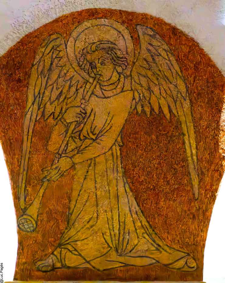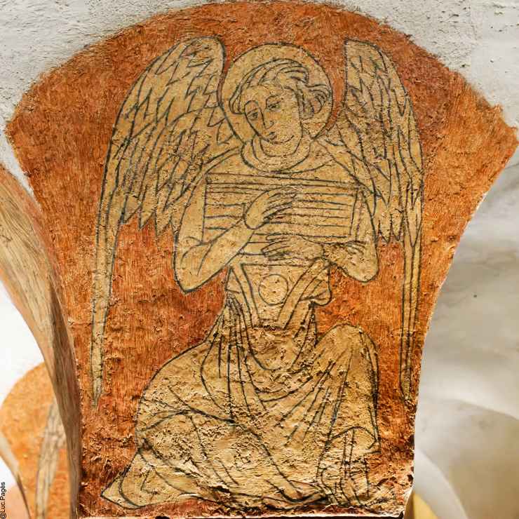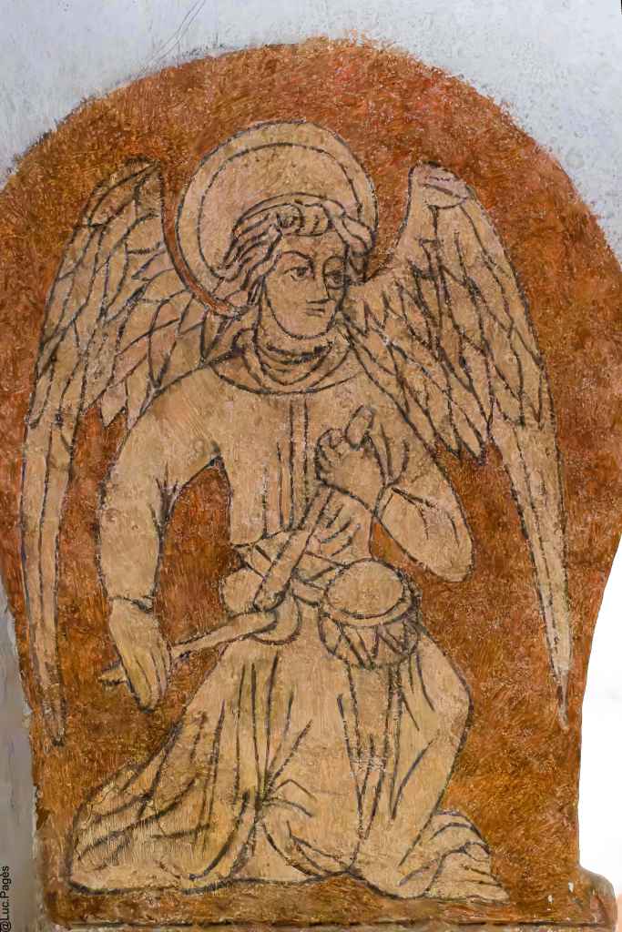 La crypte date du XIe siècle, elle comporte six travées et trois vaisseaux. Au dessus de chaque chapiteau, se trouvent des fresques du début du XVIe siècle qui représentent des anges dorés sur un fond rouge, jouant des instruments de l’époque. En voici quelques-uns qui jouent du psaltérion, du rebec, du tambour, des cloches à main, du graïle (hautbois languedocien).