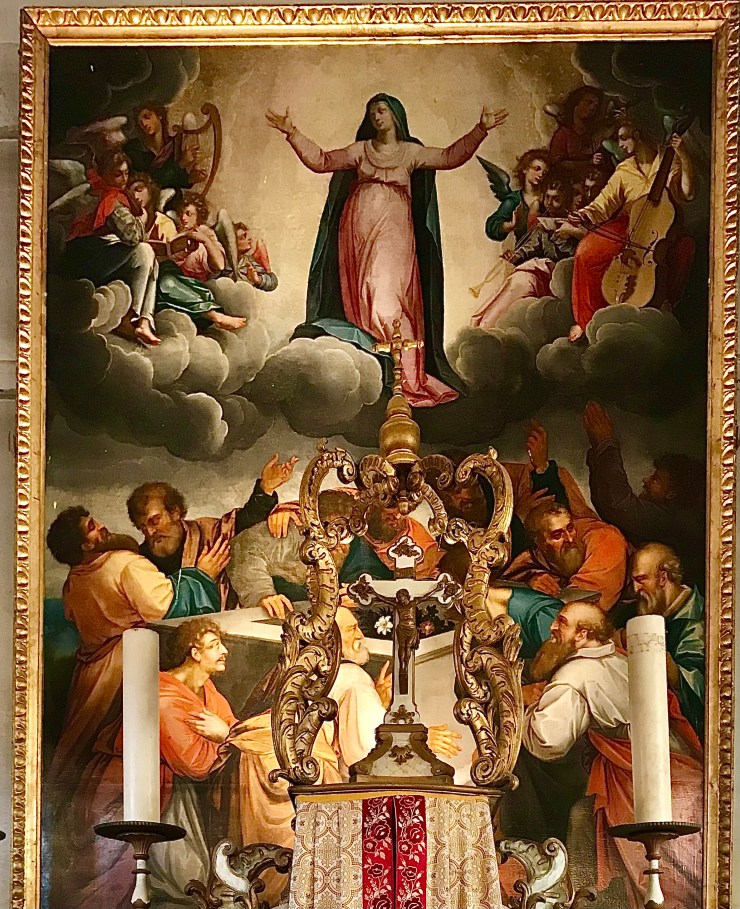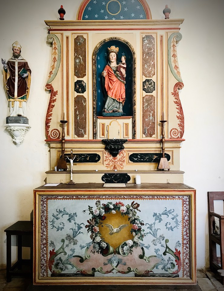 Plusieurs éléments anciens ont été cependant conservés. Le plus remarquable est le maître-autel du XVIIIe s., classé monument historique en 1974, et qui peut être rattaché à d’autres autels et retables augerons d’époque Louis XV comme à La Roque-Baignard. Il est orné aux angles de coquilles et, au centre, d’un vaste motif rocaille. Les gradins sont également décorés de coquilles et de rameaux. Le tabernacle, très beau, a une porte décorée d’un agneau couché sur une croix ; de chaque côté, de vastes ailerons enserrent des glaces destinées à protéger des reliquaires disparus. L’exposition du Saint-Sacrement est une gracieuse superposition d’éléments de coquilles déchiquetées qui supportent une croix ; une belle Assomption rappelle l’ancien retable dont aucun élément n’a survécu.
