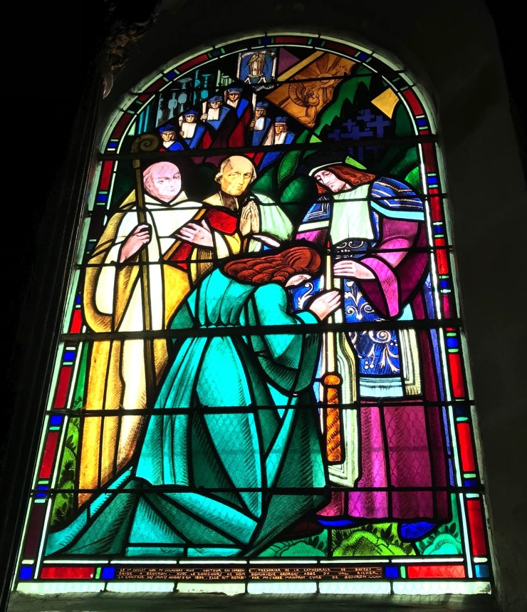 Vitrail relatant la création en 1685 de la Confrérie des Saints-Anges, avec le concours de Dominique Georges, abbé du Val Richer (personnage à gauche). Tous les vitraux de l’église sont signés Louis Barillet et datent de 1924.