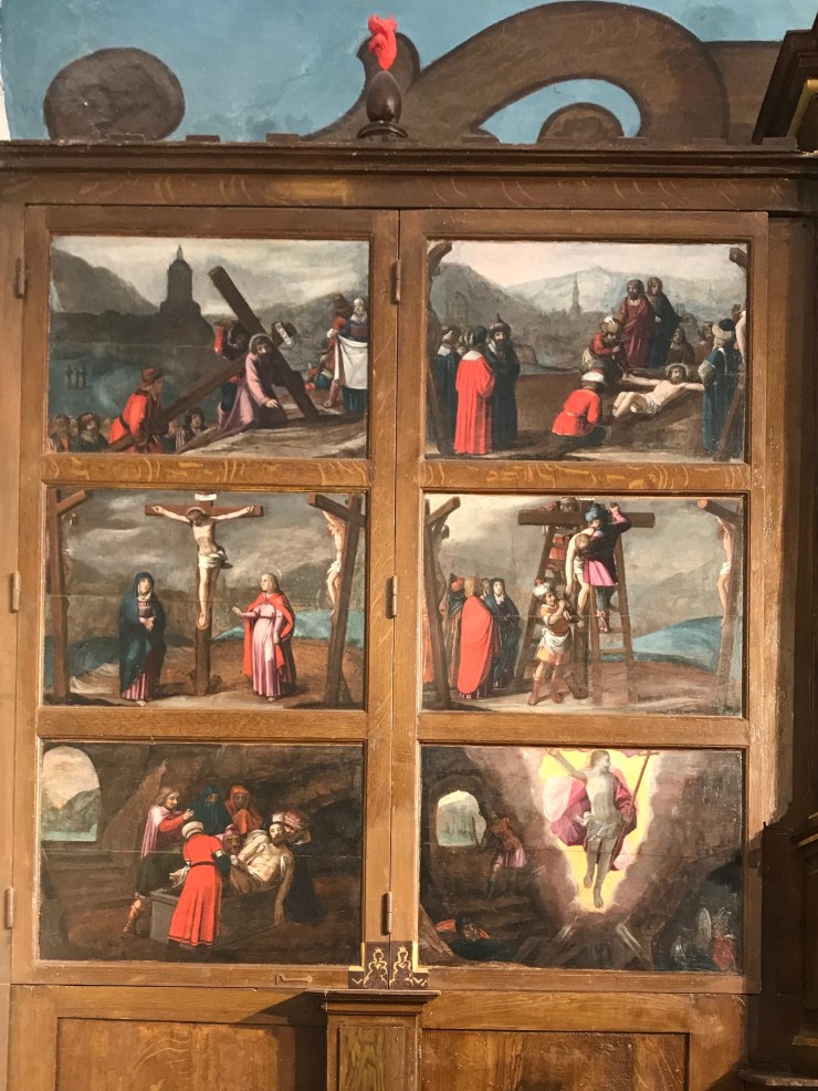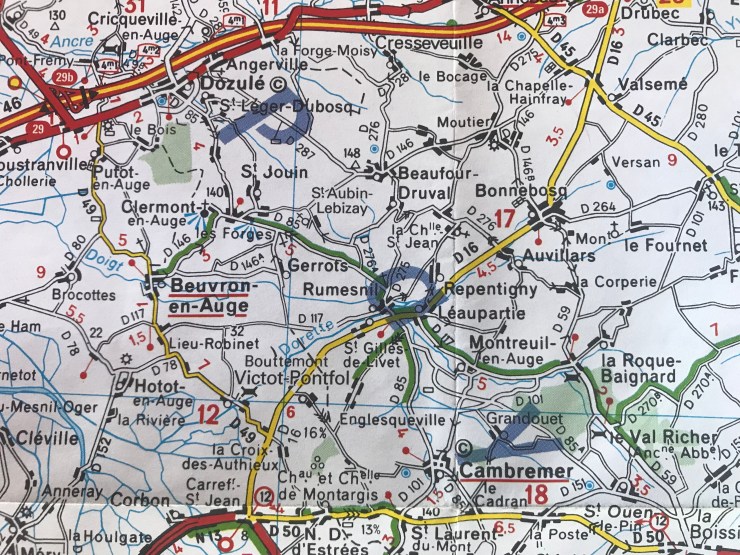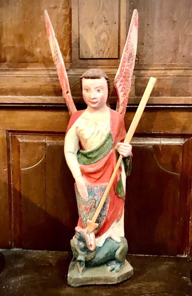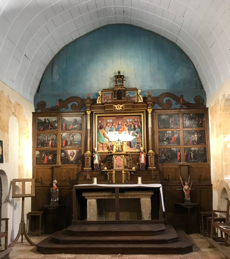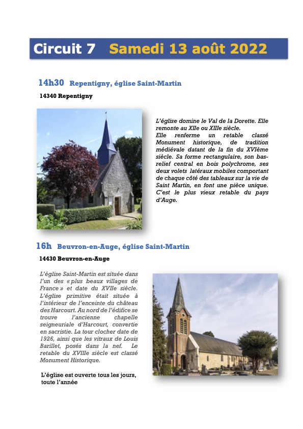 Samedi 16 août, le circuit commencera à l’église de Repentigny à 14h30. Nous y verrons le plus ancien retable du Pays d’Auge, avec les merveilleuses scènes de la vie de saint-Martin peintes sur les ailes du retable. Les ailes se referment, et surprise, voici d’autres scènes, en grisaille cette fois-ci! A Beuvron, très beau retable du XVIIIe siècle, avec un tableau représentant l’Assomption de la Vierge Marie. Vitraux fort intéressants, signés Louis Barillet et datant de 1934. On y retrouve l’éminente figure de Dominique George, abbé réformateur du Val Richer au XVIIe siècle.
