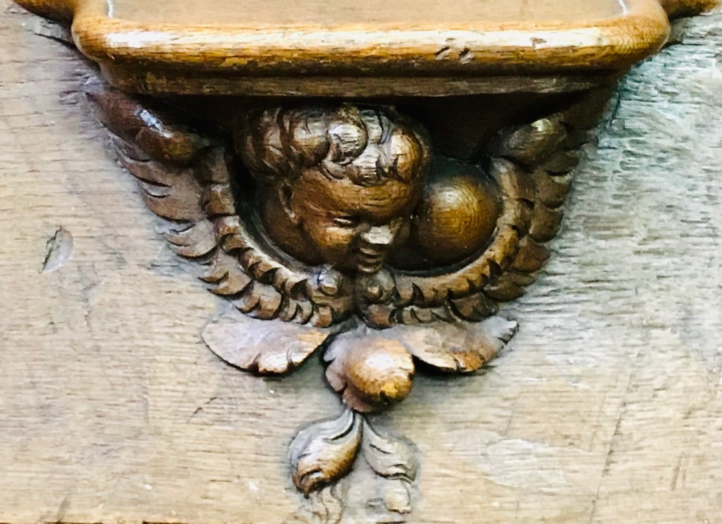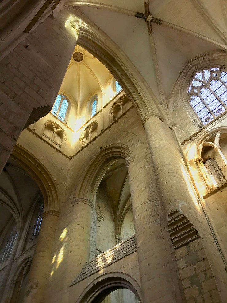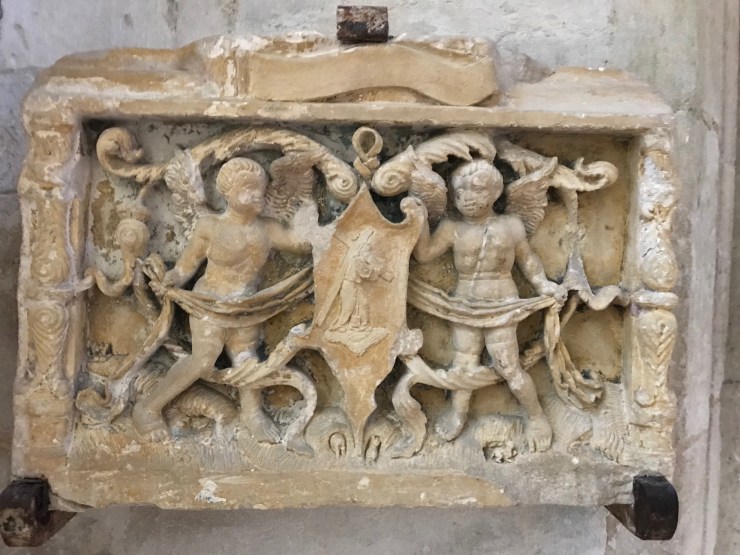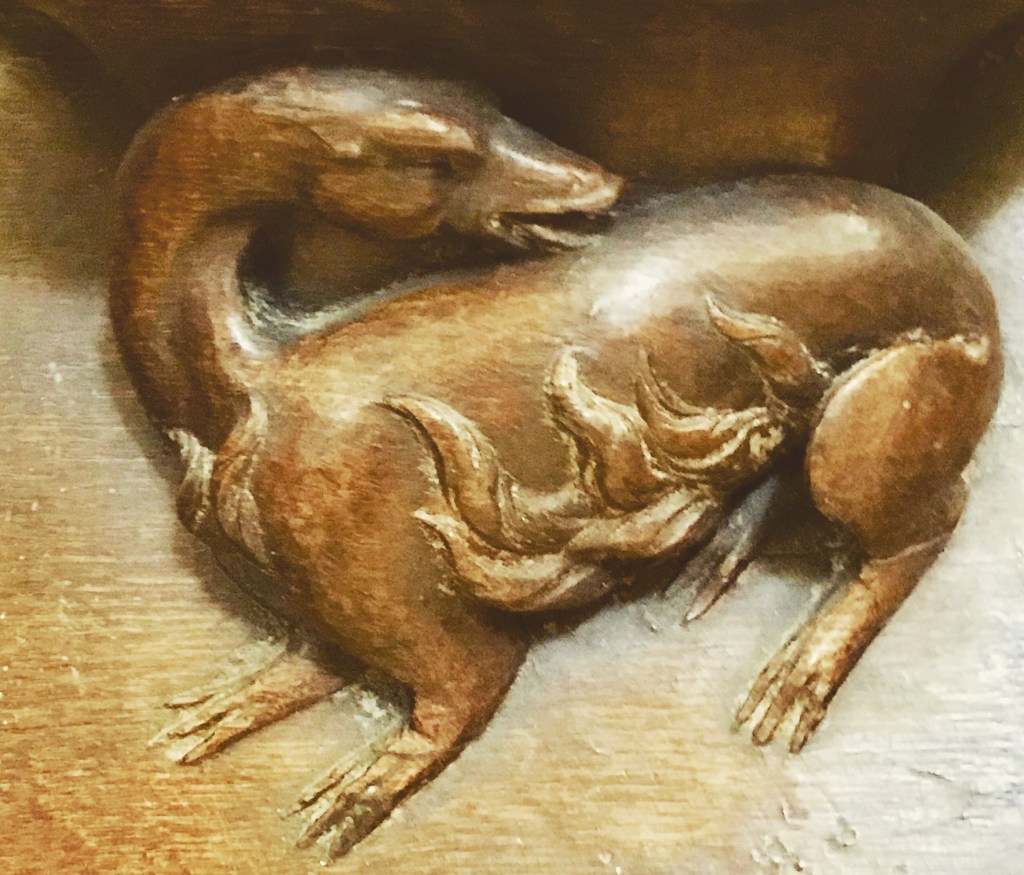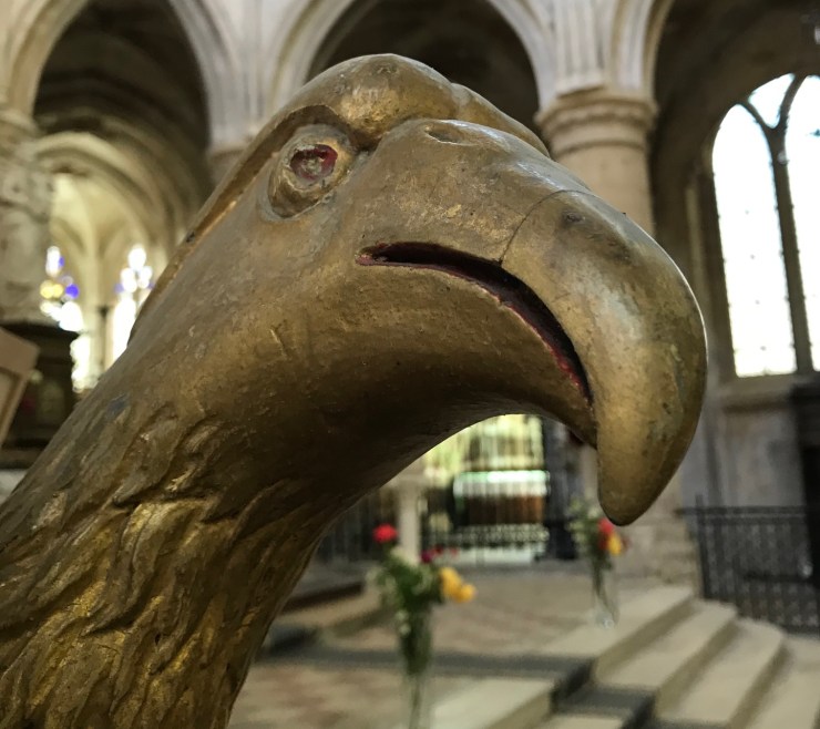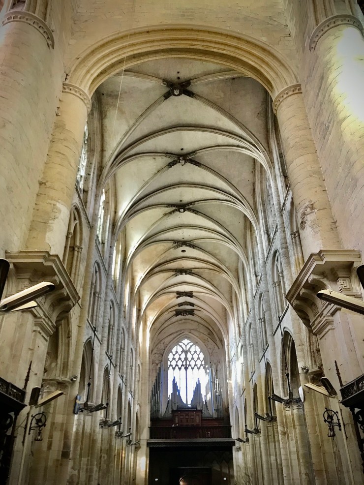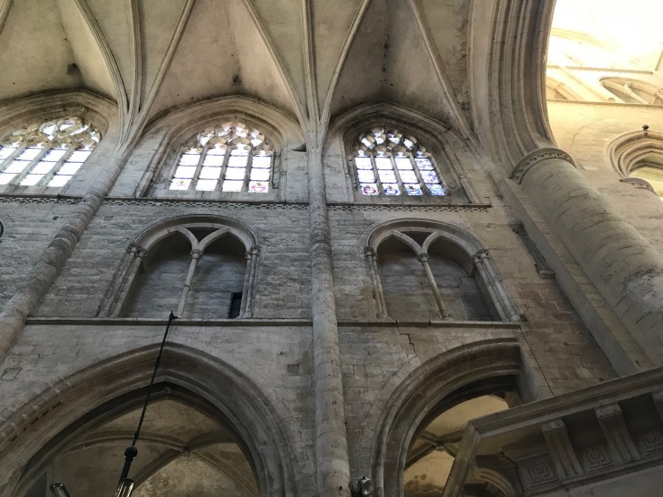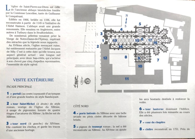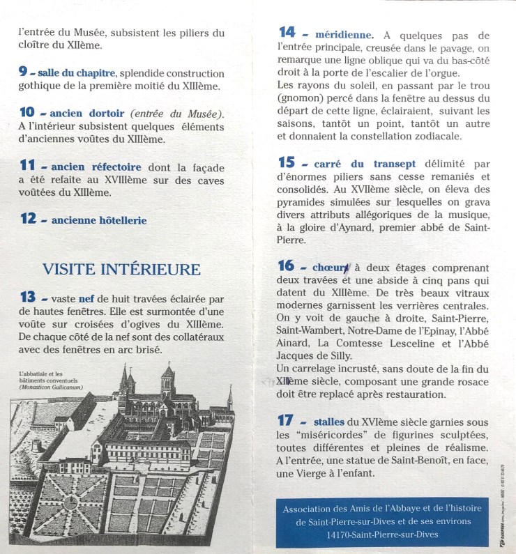 17 août 202225 décembre 2023Mariette Meunier Jeudi 18 août 2022 visite de l’abbatiale Saint-Pierre à Saint-Pierre-sur-Dives la tour lanterne, vue du chevet les grandes arcades, le triforium et les fenêtres hautes les croisées d’ogives de la nef la tour lanterne, intérieur Maitre-autel, détail du devant d’autel, boiserie bas-relief XVIe siècle : le portement de croix Le pavage du choeur L’aigle du lutrin Sculpture sous une miséricorde : tête d’angelot (XVIe siècle) Sculpture sous une miséricorde : salamandre (XVIe siècle) Explications : Association des Amis de l’Abbaye