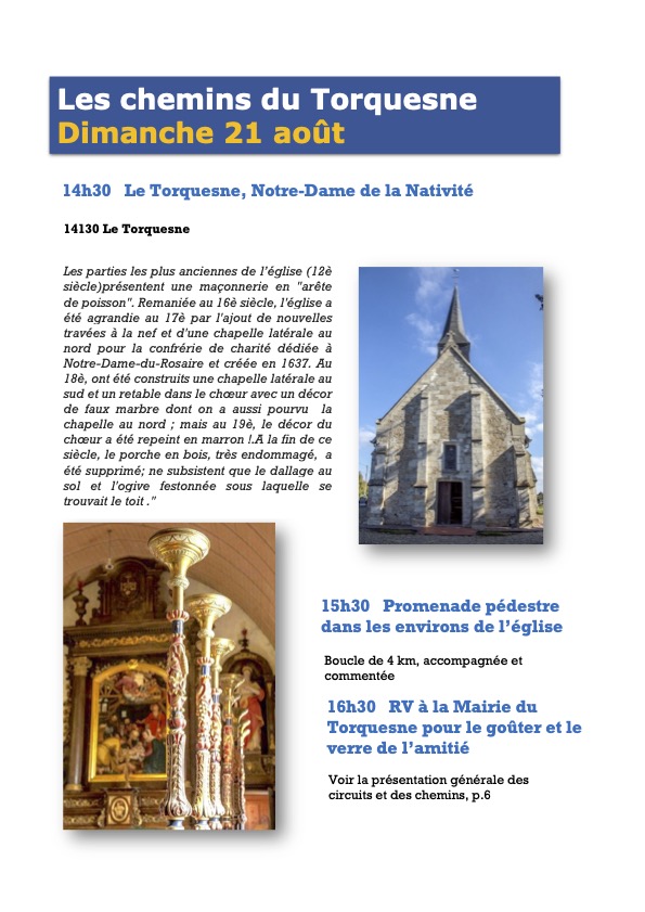 Les chemins du Torquesne commenceront dimanche 28 août à 14h30 par la visite commentée de l’église du Torquesne (Laisser les voitures au parking du tennis, non loin de l’église). Après quoi, à 15h30, petite boucle pédestre accessible à tous, accompagnée et commentée pour découvrir les paysages et les chemins des environs de l’église. Et pour finir, verre de l’amitié à la salle des fêtes.