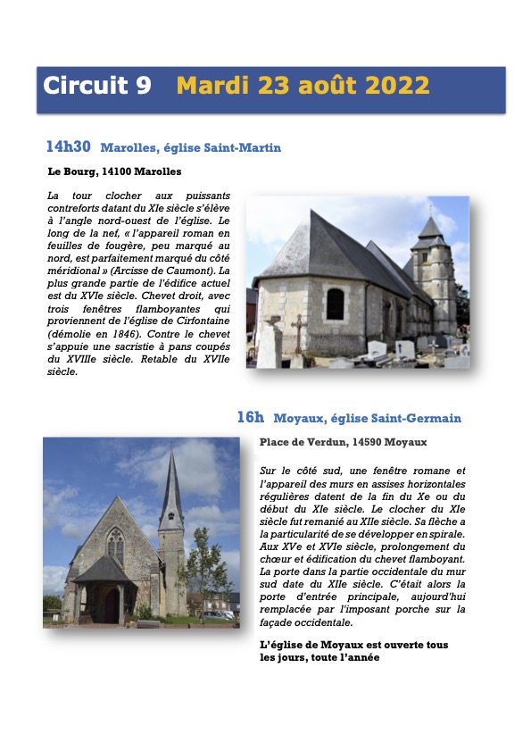 Tout d’abord, à 14h30, l’église de Marolles qui se distingue du premier coup d’oeil par sa puissante et ancienne tour clocher. Puis à 16h, l’église de Moyaux dont Jean Bergeret dit :