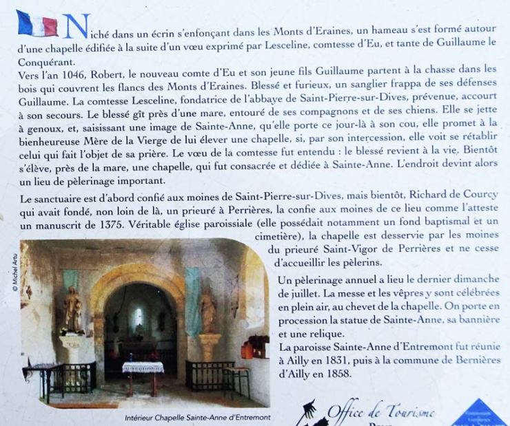 « L’église de Sainte-Anne d’Entremont, située au pied du Mont d’Eraines, était depuis 1375 une annexe de St.-Vigor de Perrières ; néanmoins elle avait des fonts baptismaux, un cimetière, et ce qui constitue une église paroissiale. Les religieux de Perrières la desservaient…