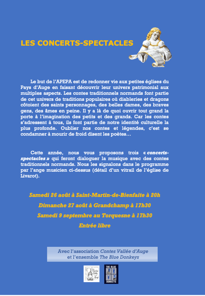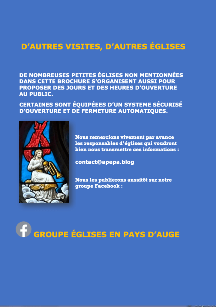 Nous attirons votre attention sur le fait que bien d’autres églises que celles du programme APEPA peuvent être visitées en Pays d’Auge cet été. Nous remercions vivement par avance les organisateurs de nous communiquer les jours et heures d’ouverture pour « leurs » églises. Nous partagerons ces renseignements sur Facebook, groupe Églises en Pays d’Auge.