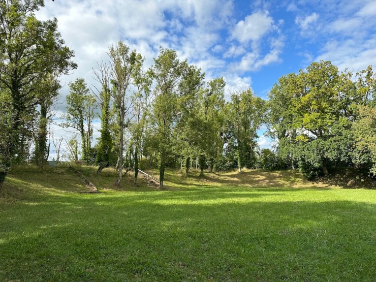 La plateforme centrale de la motte, avec son rempart de terre, envahi maintenant par la végétation, et surmonté autrefois d’une palissade en bois