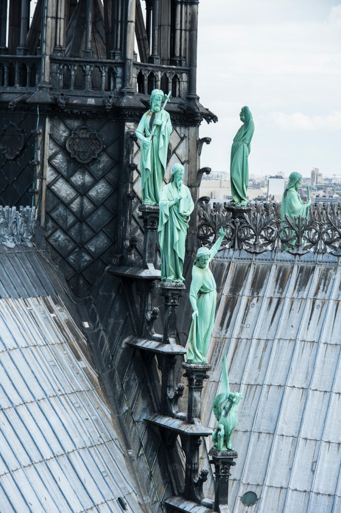Toutes ont été conçues par Eugène Viollet-le-Duc lors de la restauration de la flèche, au XIXᵉ siècle. Elles avaient été retirées pour restauration dans le cadre de travaux de rénovation, quelques jours avant l’incendie de Notre-Dame.. Cette opération leur a permis d’échapper aux flammes. En attendant d’être replacées tout en haut de Notre-Dame, au pied de la flèche, les 16 statues (12 apôtres et 4 évangélistes) sont exposées à la Cité de l’Architecture (Trocadéro) à Paris, où on peut les voir de près!