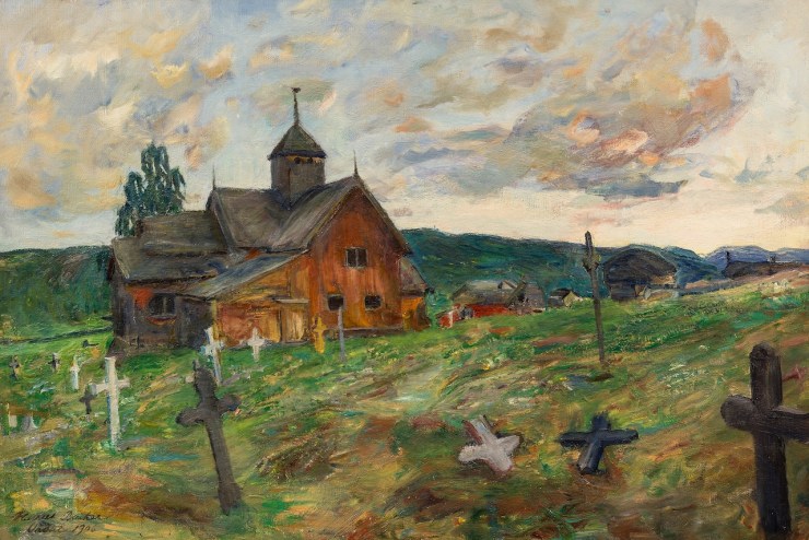 Au cours des étés 1904 et 1909, Backer travaille longuement dans l’église « en bois debout» d’Udval, un édifice médiéval construit intégralement en bois, caractéristique de la Norvège, dont les décors peints datent ici du XVII siècle. L’église, désaffectée en 1893, appartient depuis 1901 à la Société norvégienne pour la préservation des monuments historiques, qui facilite les séjours de l’artiste, très inspirée par cette architecture originale et cet intérieur aux couleurs vives, typiquement norvégiens.