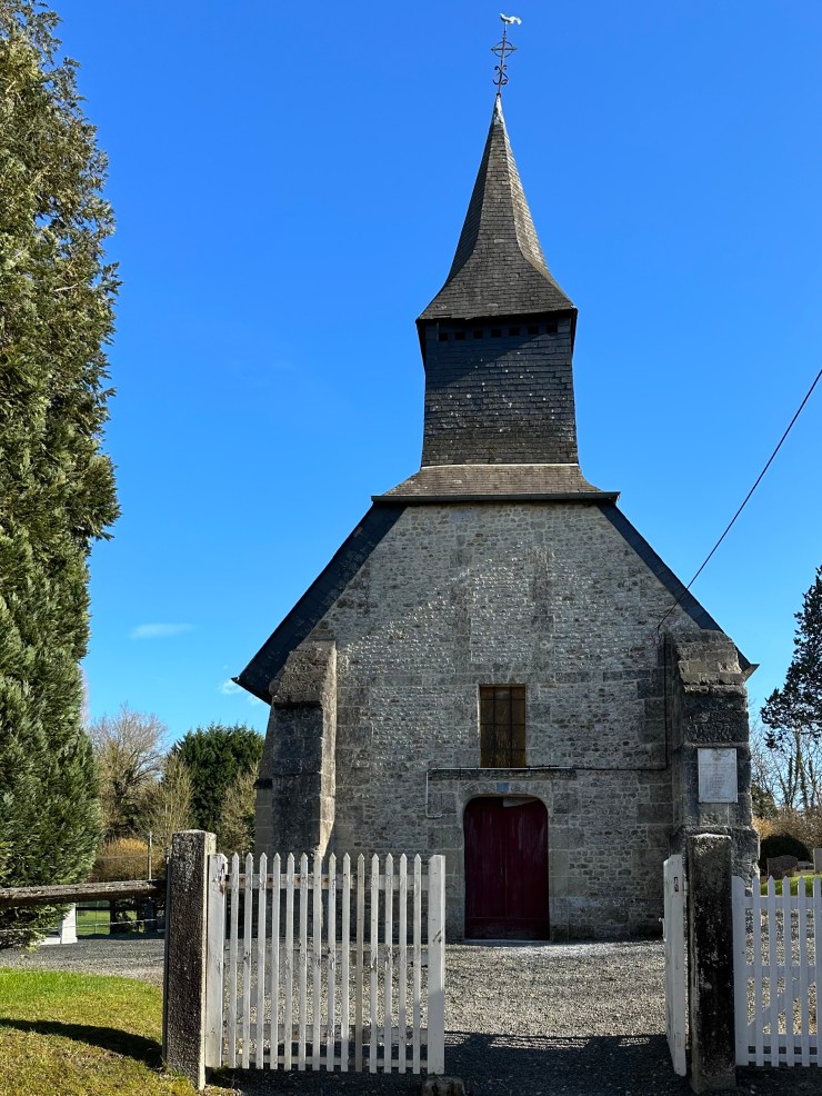« L’église de Douville, située à peu de distance de la roule d’Annebault à Dives, appartient à deux époques distinctes. La nef est romane et remonte au XIIe. siècle.