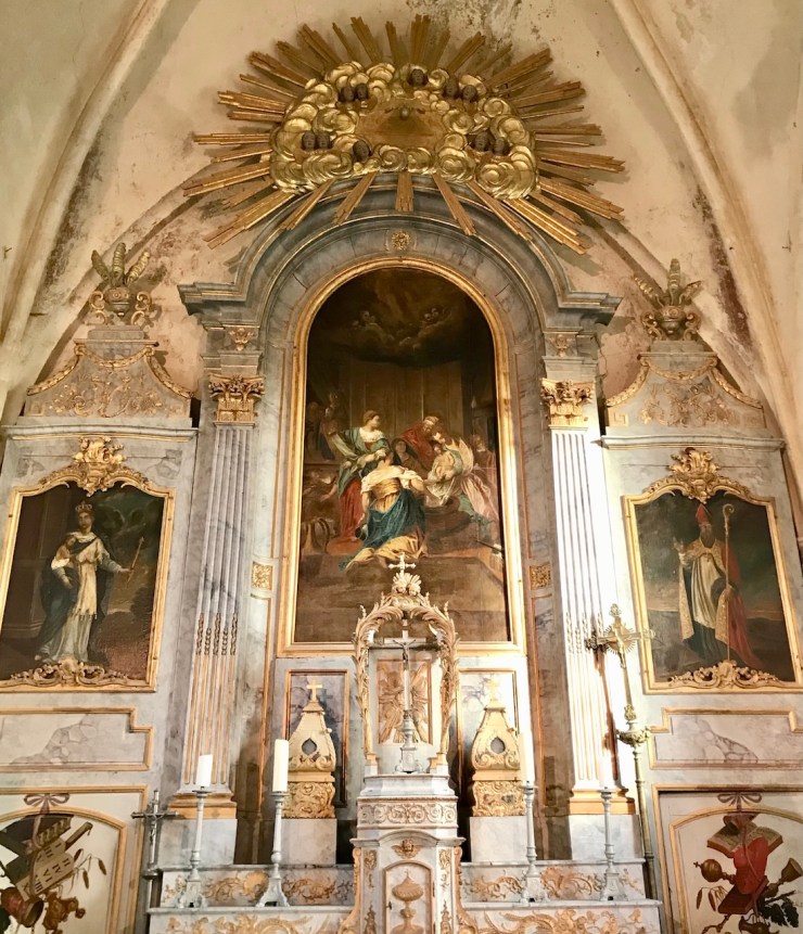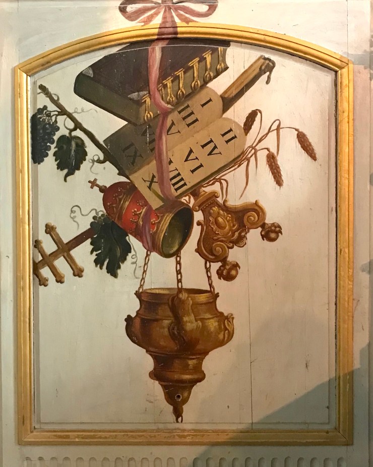 Sur la photo, une curiosité : les bandes de couleurs bleu, blanc, rouge, sous le tableau. Elles font le tour de l’église, à l’instar des litres funéraires de l »Ancien Régime. Ce sont en quelque sorte des « litres révolutionnaires »!