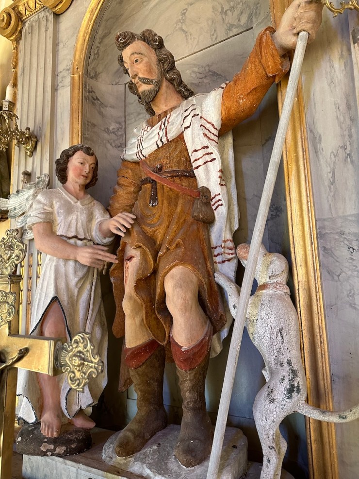 Saint Roch est très présent dans les églises du Pays d’Auge. Il était invoqué pour les épidémies de peste. Il esst toujours représenté montrant le bubon de la peste sur sa jambe, et accompagné de son chien qui lui apporte du pain, ainsi que de son ange protecteur.