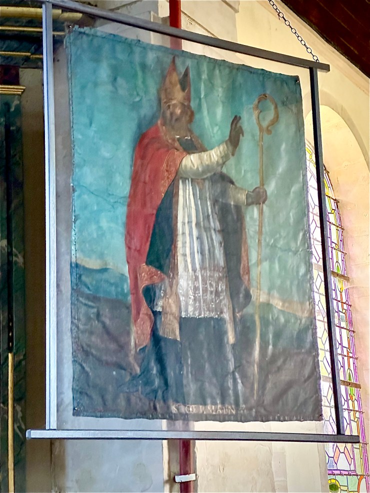 Les bannières sont habituellement en tissu brodé. Celle-ci est une toile peinte. Les bordures en tissu qui entouraient la toile n’ont pas été conservées. La toile est actuellement présentée entre deux plaques de plexiglass et accrochée à son emplacement d’origine, entre l’autel nord et le choeur.