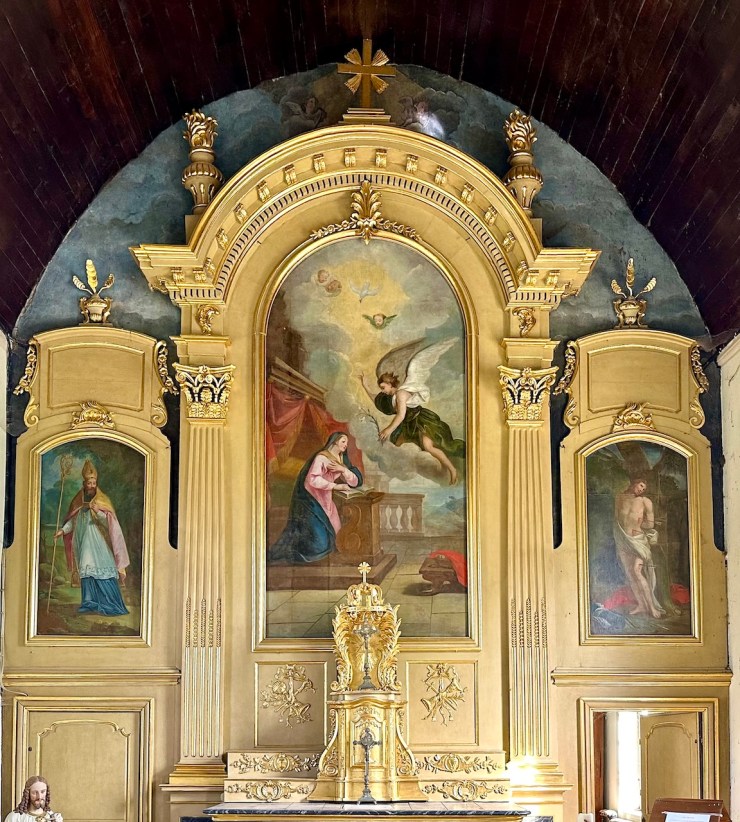 Le tableau du retable représente Le Christ à la colonne. A gauche, la statue de Saint Marcouf, le patron de l’église, et à droite, la statue de saint Maclou.