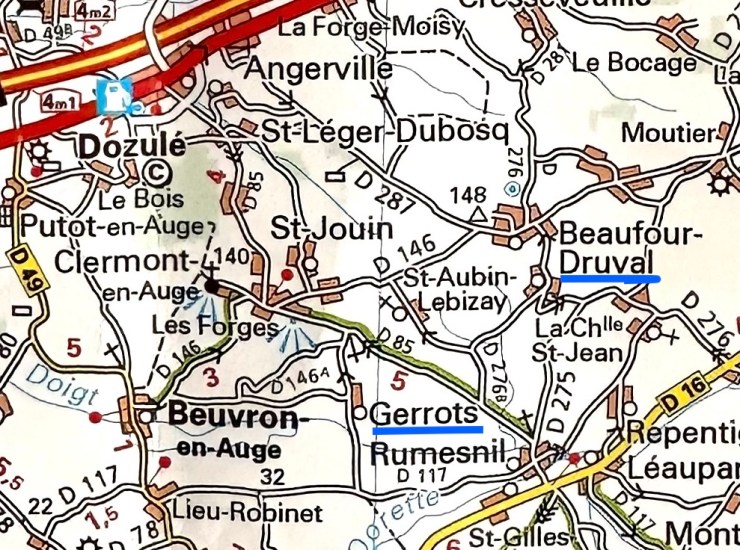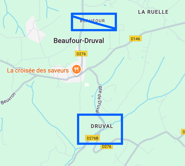L’église de Druval, commune historique, que nous visiterons le 30 juillet, se trouve sur la commune nouvelle de Beaufour-Druval. Il ne faut donc pas se rendre dans le carré bleu barré.