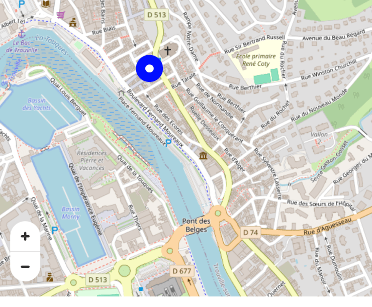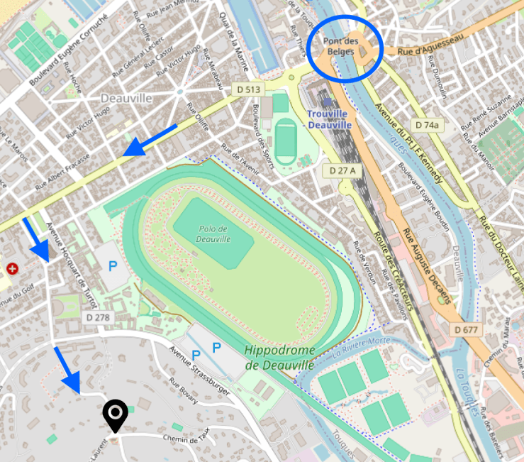 A partir du Pont des Belges (qui sépare Deauville de Trouville), prendre l’avenue de la République. Tourner à gauche rue Florian de Kergolay, continuer sur la rue du Moulin-Saint-Laurent. Garez-vous ou vous pourrez, c’est une rue étroite!