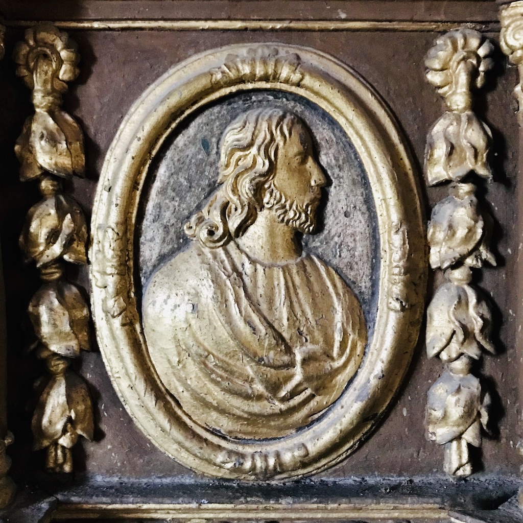 Au centre, deux colonnes corinthiennes lisses et des chutes de feuillages entourant le Christ. Sur les ailes, deux bas reliefs représentant le Christ et la Vierge. La couleur marron a été appliquée au XIXe siècle. A l’origine, l’ensemble du retable était vraisemblablement dans des tons pastels. Le tableau d’origine, au centre du retable, a disparu.