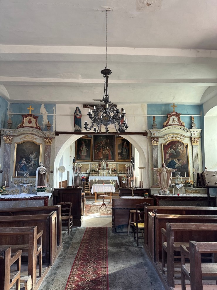 Le choeur, en retrait sur la nef, peut dater du XIIIe. siècle ou de la fin du XIIe. ; la fenêtre bouchée du chevet remontait peut-être à cette époque; du côté du nord, on a percé des fenêtres arrondies, au siècle dernier. »