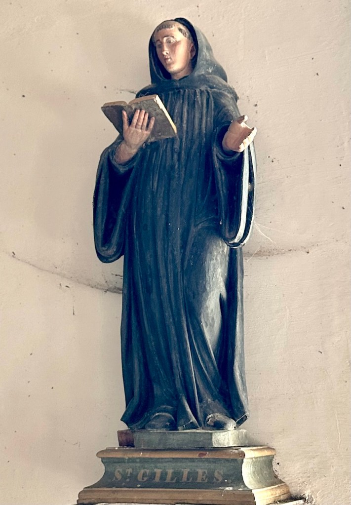La biche est un des attributs de saint Gilles : il dfut blessé par une fèche alors qu’il protégeait une biche traquée par les chasseurs. Gilles est aussi représenté avec la coule et la crossse ou le livre d’abbé bénédictin.