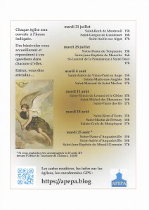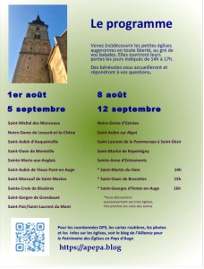 Dès 2019, l’année de création de l’APEPA, nous proposions 9 églises en visite libre sur les 4 premiers samedis de juillet, août, septembre et octobre.