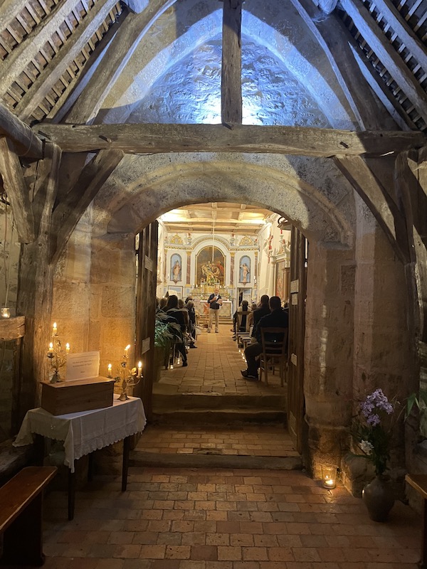 Pendant les vacances de Toussaint, nous avons repris l’animation « La nuit des retables » initiée par l’association Le Pays d’Auge. Il s’agit d’une soirée pour visiter successivement deux églises illuminées, découvrir leur retable et rêver avec les contes de Nadine Grammare et le violon de Dimitri Derat, nos deux magiciens.